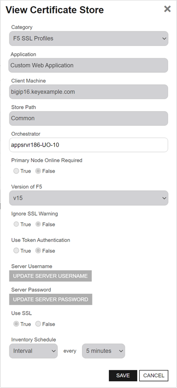 - For F5 certificate stores, in the Use Token Authentication field, either accept the default of false, to use basic authentication for all communications with the F5 device, or true, to use basic authentication for the initial connection to the F5 device to acquire an authentication token which will be used for all subsequent API requests.