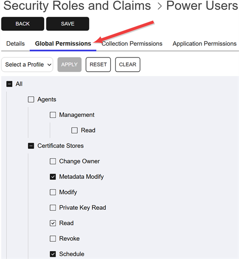 System-wide certificate store permissions are controlled with the Certificate Stores role permissions on the Global Permissions tab of the Security Role Information dialog.