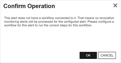 If you enabled the Use Workflow option and are saving an alert that does not have a matching workflow, you will receive a notification indicating that a workflow needs to be created to match the alert. When you click OK to the notification, you will be redirected to the workflow page with a new workflow open and pre-populated with the Name, Type, and Revocation Monitoring Alert (key) appropriate to the alert you have saved.