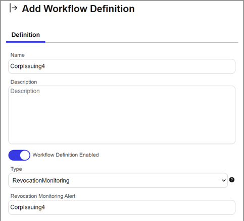 - You will be redirected to the workflow workspace for the workflow associated with the selected alert. If a workflow does not exist for the selected alert, one will be created and pre-populated with the Name, Type, and Revocation Monitoring Alert (key) of the selected alert. Edit the workflow as needed (see Adding, Copying or Modifying a Workflow Definition).