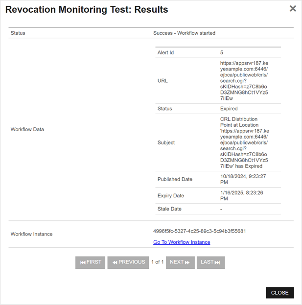 In the Revocation Monitoring Test: Results dialog, you can review the generated alert to confirm that the alert and the recipients are as expected. Scroll the First, Previous, Next and Last buttons at the bottom of the dialog. The number of alerts generated will display between the navigation buttons.