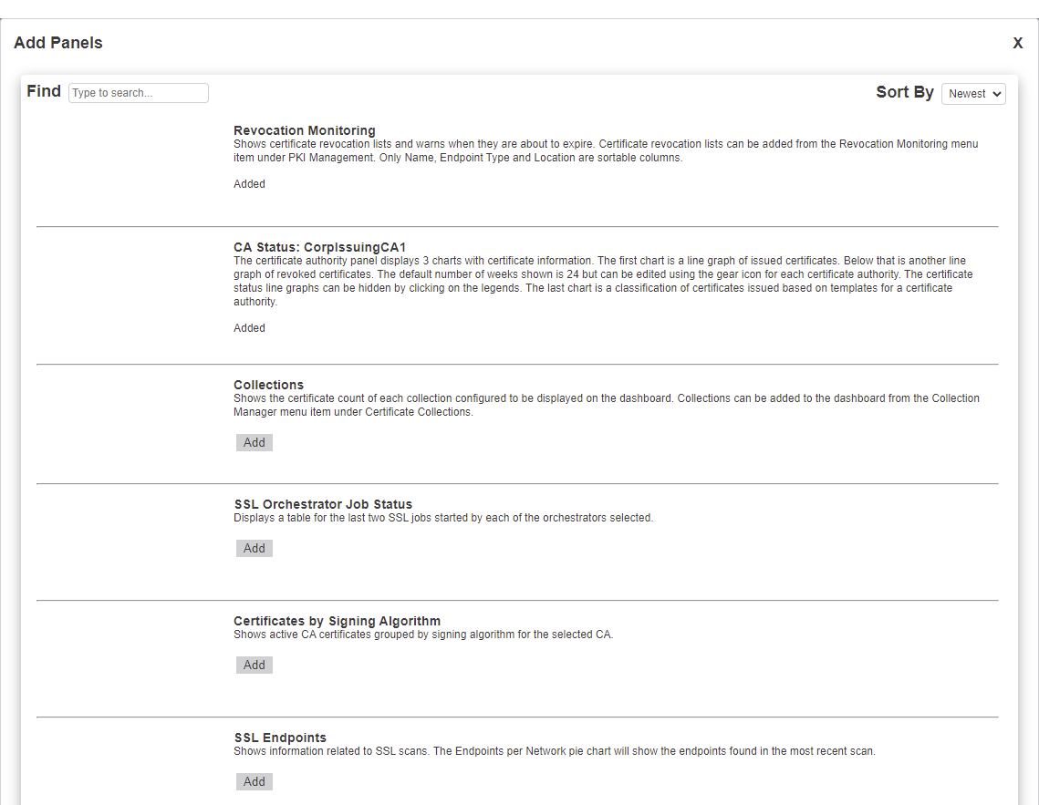 A Certificate Revocation List (CRL) is a list of digital certificates that have been revoked by the issuing Certificate Authority (CA) before their scheduled expiration date and should no longer be trusted.) or online certificate status protocol (OCSP) locations for monitoring and opt to display them on the dashboard (see Revocation Monitoring), these will appear with a status on the dashboard Revocation Monitoring panel. See Dashboard: Revocation Monitoring. - The comprehensive SSL Endpoints panel includes a grid of changes found in existing SSL endpoints, a grid of endpoints with certificates expiring in the next X days, a pie chart showing SSL endpoints per defined SSL network, and a pie chart showing the results from the last SSL scan broken out by result (e.g., certificate found, connection timed out, connection refused). The number of days for the expiring certificates grid is configurable. See Dashboard: SSL Endpoints.