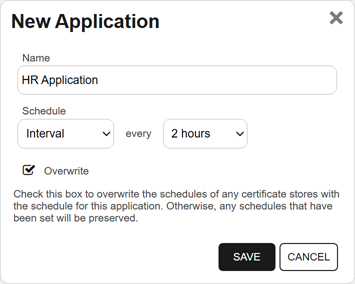 In the Schedule fields, select an inventory frequency to apply as a default to certificate stores added to the application. The choices are: