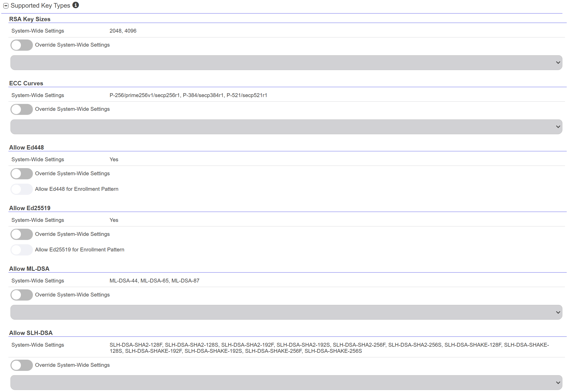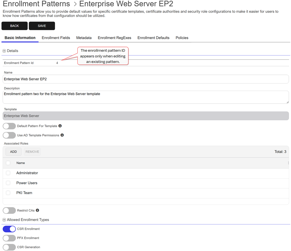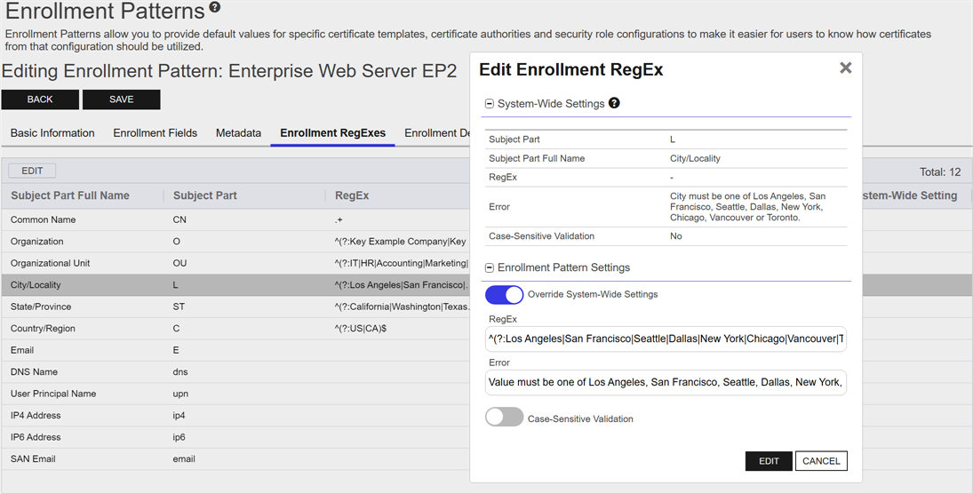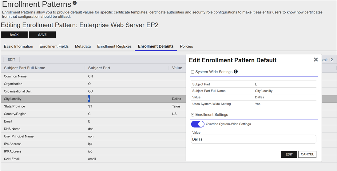 EnrollmentClosed Certificate enrollment refers to the process by which a user requests a digital certificate. The user must submit the request to a certificate authority (CA). patterns in Keyfactor Command provide a flexible way to streamline certificate enrollment by defining default values, policies, and access configurations for specific certificate templates and certificate authorities. This functionality helps reduce duplication of templates at the CAClosed A certificate authority (CA) is an entity that issues digital certificates. Within Keyfactor Command, a CA may be a Microsoft CA or a Keyfactor gateway to a cloud-based or remote CA. level while meeting diverse business requirements. On this page, you can manage enrollment patterns by adding, editing, and deleting them, configuring system-wide settings, and copying existing patterns to create new ones. These operations ensure enrollment processes are tailored to user groups, enforce security policies, and simplify certificate management.