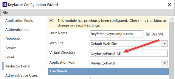 6. Update the Virtual Directory names on the Keyfactor Portal, Dashboard and Reports, Orchestrators, and API tabs to the names you wish to use going forward.