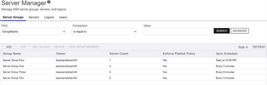 On the Server Groups tab of the Server Manger page you create server groups that allow you to organize SSHClosed The SSH (secure shell) protocol provides for secure connections between computers. It provides several options for authentication, including public key, and protects the communications with strong encryption. servers and set synchronization schedules and management policies on a group level. You must create at least one server group before you can add SSH servers into the Keyfactor Command Management Portal.