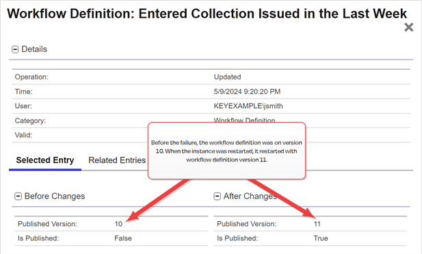 After restarting a workflow instance, you can view any differences between the original instance and the newly restarted instance by looking at the audit log record (see Audit Log Operations) for the workflow instance restart. The Related Entries in the audit log record do not include the original workflow instance that failed since restarting a workflow instance generates a new workflow instance.