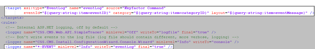 By default, messages redirected to the event log are marked with a source of Keyfactor Command for Keyfactor Command server, Keyfactor Service for the Keyfactor Command Service, and Keyfactor Orchestrators or Keyfactor Orchestrator for the Keyfactor Universal Orchestrator