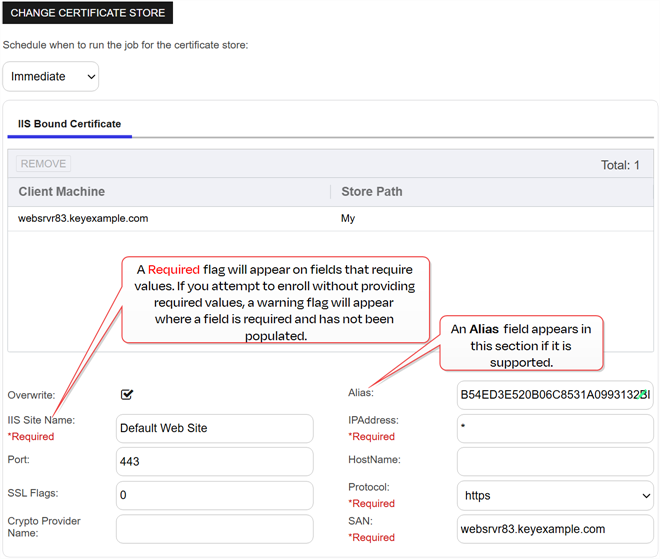 Additional fields will appear on the page in a grid section once you have selected a certificate store.