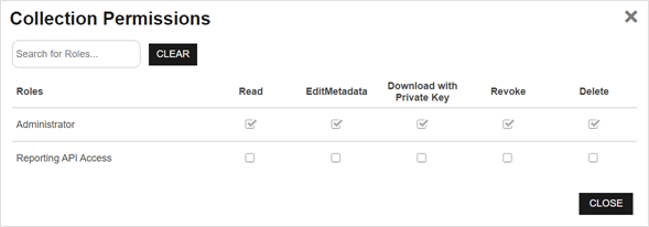 • Permissions: Select a row and click Permissions from the action menu to view collection level permission for the collection (see Certificate Collection Permissions for how to change collection permissions).