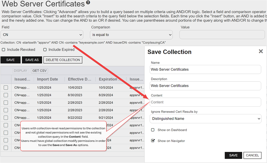 Note:  Users with global read permissions for collections will see the existing collection query in the Content field of the Save Collection dialog with either the Save or Save As option and may edit the existing collection query. Users with collection-level read permissions only (not global read) will not see the existing collection query in the Content field. These users will only be able to append to the existing collection query. Any query added to the Content field will be added with an AND clause together with the existing query. This is done to prevent users with collection-level read permissions from potentially widening the scope of the query and seeing certificates they aren’t supposed to see.