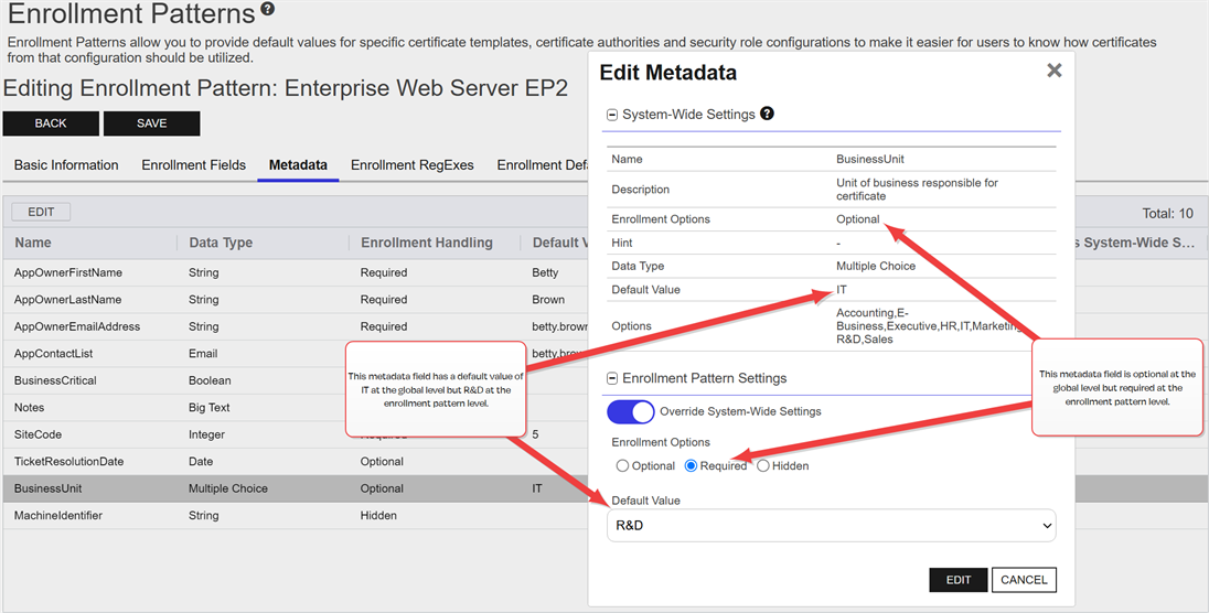 EnrollmentClosed Certificate enrollment refers to the process by which a user requests a digital certificate. The user must submit the request to a certificate authority (CA). patterns in Keyfactor Command provide a flexible way to streamline certificate enrollment by defining default values, policies, and access configurations for specific certificate templates and certificate authorities. This functionality helps reduce duplication of templates at the CAClosed A certificate authority (CA) is an entity that issues digital certificates. Within Keyfactor Command, a CA may be a Microsoft CA or a Keyfactor gateway to a cloud-based or remote CA. level while meeting diverse business requirements. On this page, you can manage enrollment patterns by adding, editing, and deleting them, configuring system-wide settings, and copying existing patterns to create new ones. These operations ensure enrollment processes are tailored to user groups, enforce security policies, and simplify certificate management.
